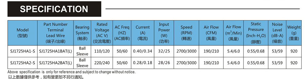尺寸:150x150x51mm 框架:鋁ADC-12 軸承:含油軸承& 雙滾珠軸承 電壓:AC 110V 220V 380V440V 壽命:60 000Hours at 20℃--滾珠軸承 30 000Hours at 20℃--含油軸承 工作溫度:-20℃~70℃ 正常濕度 儲存溫度:-20℃~85℃ 正常濕度